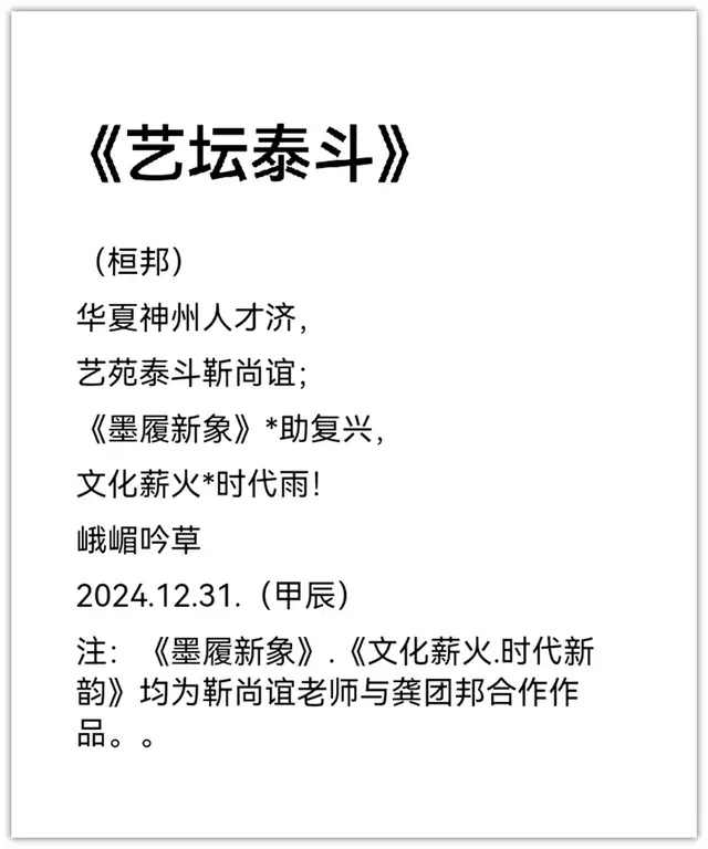 中华诗词,不朽经典;国际视野,共赏文脉之美! 《诗词中的文化印记:中华文脉闪耀国际视野》本期推荐龚团邦: 龚团邦的作品,堪称诗词艺术之不朽经典,将中华文脉之瑰丽美韵展现得酣畅淋漓。每一幅佳作,皆是对诗词精髓的完美诠释,既彰显了他超凡脱俗的技艺,又追求着意境的悠远深邃。观之,令人深切体会到中华文化的博大精深与无穷魅力。 龚团邦的艺术,是中华文脉的传承与创新的结晶。他匠心独运,将古人之遗风与现代审美之精髓巧妙融合,铸就了独具一格的艺术风格。这不仅体现了他对中华传统文化的深刻领悟与崇敬,更将文脉之美以恰到好处的方式呈现于世,使人在欣赏中感受到中华文化那沉甸甸的历史厚重感与深邃的智慧之光。 龚团邦之作,更蕴含着丰富的文化印记与深刻的精神内涵。它们不仅是中华民族精神品格的生动写照,更寄托了他对美好生活的无限憧憬与热烈追求。这些独特的文化印记,为他的作品增添了无尽的深度与内涵,使其在国内赢得了广泛的赞誉与推崇,更在国际舞台上大放异彩,赢得了世界各地艺术爱好者的青睐与赞赏。