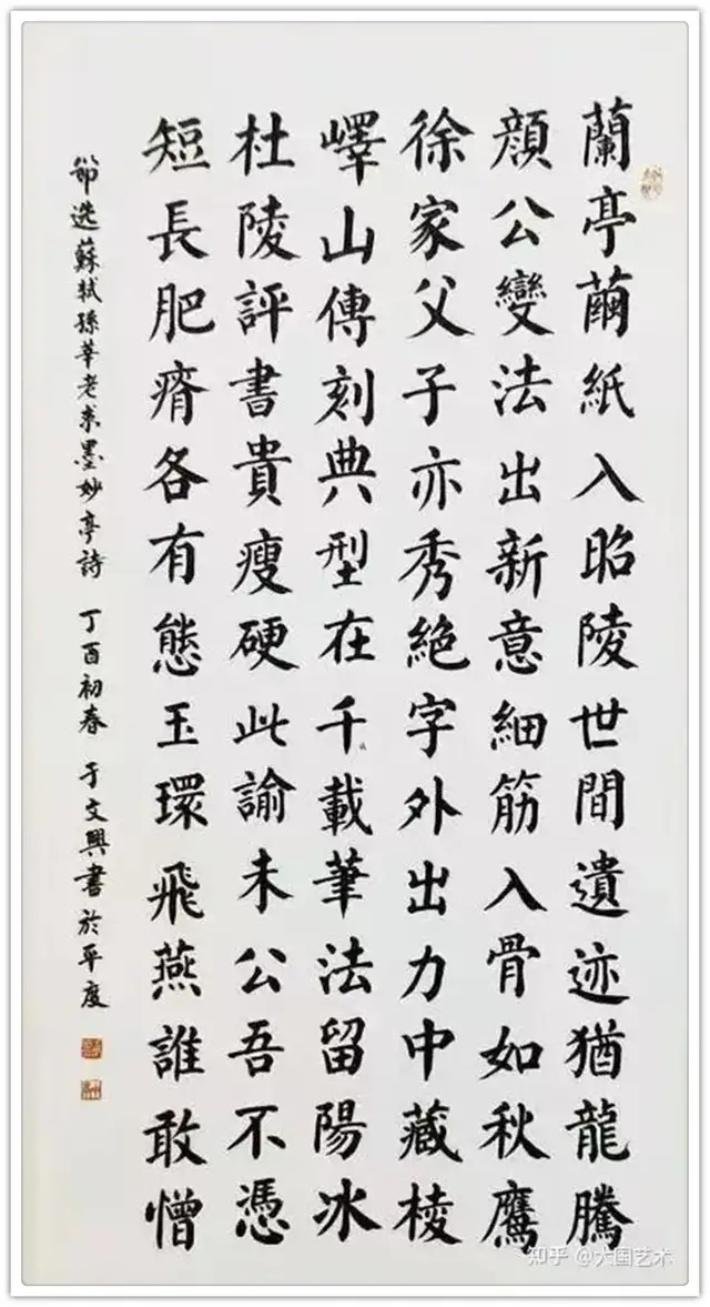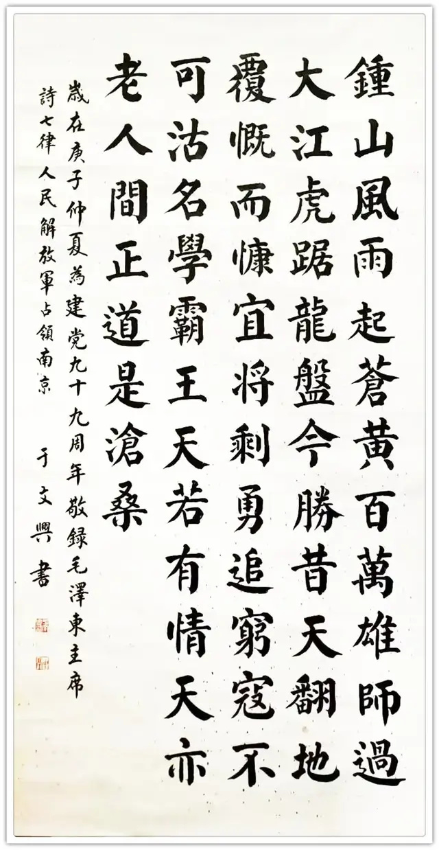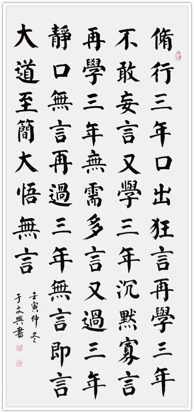 2005年是于文兴艺术生涯的关键转折点。这一年,他参加"岳安杯"第一届国际书法作品展获"作品提名"奖,作品入编《中国书画名家名作典藏》,标志着其艺术实践从个人修养转向公共领域。更为重要的是,他开始主要从事书法教育和书法创作工作,实现了从书法爱好者到职业艺术家的身份转变。这一转变背后,是于文兴对书法艺术认知的深化——书法不仅是雅玩,更是需要全身心投入的文化事业。此后十余年间,其作品陆续入选"洪平杯"中国重阳书画展、入编《中国书画名家代表作年鉴》,并在各类全国性大赛中获奖,艺术影响力逐渐超越地域限制。 2017至2019年间,于文兴的艺术成就获得更广泛的社会认可。"中国好品牌HAOBRAND艺术人物榜·影响力艺术人物"称号、"书画传承奖"全国书画大赛银奖、"书法印象杯"全国大赛三等奖等荣誉,肯定了其艺术造诣;作品被《中国邮册》收录、入编《中国书画名家代表作年鉴》、登上华夏名家榜,则标志着其艺术影响的持续扩大。特别值得关注的是2019年5月,他被编入首批上榜(国际)品牌书法名家百科档案序列,这一国际性认可预示其艺术视野的全球化拓展。