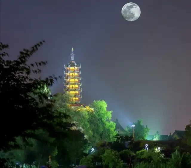 于是我快步来到北湖江河交汇口。月色下,金山、北固山、焦山山水相映,独具匠心的金山北湖“一水”串“三山”。北通扬子江、南接大运河,展现了长江千年水文化的大江大湖风貌,正带给人们更多的憧憬与希冀。不到十分钟,我“打的”到了目的地的金山脚下。
