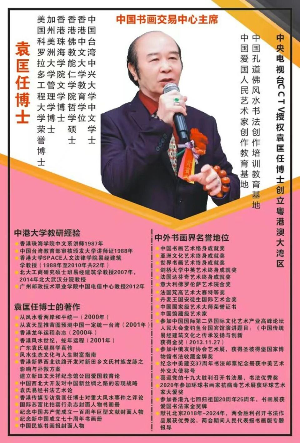 袁匡任博士,祖籍广东深圳市,香港人,香港爱港爱国书法家协会主席。现为:2024 年中国(香港)书法家协会名誉主席。2024 年中国书画家终身成就奖。 世界非物质文化遗产研究院院士、中央电视台CCTV 艺术组委会 授权袁匡任创立香港大湾区,中国孔道佛风水能量书法创作教育基地。 中央电视台 CCTV 授权袁匡任创立香港大湾区,中国爱国人民艺术家书法创作教育基地。 世界华人书画家协会深圳市分会主席,深圳市孔子易经风水书法艺术院院长,中国民族建筑研究会书画艺术专业委员会理事会副主席,中国书画家联谊会新文艺群体书画家工作委员会副秘书长,中国互联网联盟艺术总监,国际名人百科外联部主任国际名人百科会员,香港大中華文化總會執行會長,大中華青年總會監事長,大中華慈善總會家風家教傳承委員會主席,中华两岸和平统一书法会长,袁氏道佛风水能量书法馆长,袁氏儒道佛风水能量书法馆长,中国名人书画艺术界联合会主任委员,国家一级书法师,香港文联会员,中国台湾国立中兴大学中文系学士,香港中文大学教育学位,香港佛教能仁学院硕士,香港珠海大学文史研究所博士毕业,美国加州美洲大学管理学博士,美国科罗拉多工程大学艺术荣誉博士。香港马克思主义研究院院长,创立香港袁天罡道符图腾书法创作教育基地。 艺术人生 任教香港珠海大学,获中国台湾教育部颁发讲师证书,该校是台湾注册,并颁学位。香港当年唯一所大学,唯一的一次颁讲师证的获得者袁匡任老师! 1987 年任教香港珠海学院中文系讲师。 (1988 年)香港大学人文法律学院易经建筑学教授(1988 年—2010 年),(1988 年)入道香港青松观,道号罗峰(1999 年)获广东博罗,罗浮山千年九天观,名誉主持证书,(2007 年)北京大学工商研究易经地理环境学教授,(2010 年)香港岭南大学广州国立邮电学院中国电讯中心教授(2016 年 10 月“)新万里长城刻碑杰出道佛法书家金奖”。 2012 年广东邮电职业技术学院中国电信中心易经建筑学教授。 2013 年,11 月 26 号,参加北京国际第二届文化艺术企业高峰研讨会,在人民大会堂钓鱼台国宾馆演讲论文:中国传统易经建筑学之传承发扬与创新获得金奖。 2016,参加中俄友好协会圣彼德国家博物馆书法收藏金奖。纪念中美建交 37 周年书法大使称号!2017年,喜迎党的十九大胜利召开书法展出优秀奖。庆祝十九大胜利召开书法纪念邮册首发奖。参加湖南纪念毛主席诞辰 124 周年大会,当大会名誉主席。 (1983 年)香港佛教能仁研究所,硕士论文,题目是《论孔学与周易(2003 年)在香港珠海大学博士论文,题目是《堪舆学探原,学理及对香港社会之影响》2017年庆祝香港回归祖国 20 周年书画展览杰出爱国人士奖。 2018 年书画界献礼北京两会焦点杰出人物。 2018 年两会人民代表报书画界杰出代表人物。 2018 年美国华尔街日报中国道佛能量书法展出奖。 2018 北京民族艺术报共筑中国梦辉煌四十年优秀奖,北京文联出版社 2018 年 12 月出版,新时代四十年书画家作品选书法家代表。 2018 年庆祝工合协会成立八十週年北京人民大会堂书法参展杰出奖。 2018 年海南博鳌文化彰大会当代书画家出展优秀奖, 2018 年北京十一国庆书法贡献奖,中国改革开。 2019 年剑桥大学中英艺术家终身成就奖 2020 年,中国环球抗疫行,获书画家环球大爱无彊大使称号。 2023 年,影响全球十大书画家风云人物。 2023 年度,全国书法名家,人气综合指数排名第六名。中国传统道佛能量书法传人,审定为国家非物质文化遗产传承人。 2023 年,百度国际名人百科主席 2024 年,中国国馆藏级艺术家 2024 年,中俄友谊艺术展作品金奖 2024 年,中国第六届兰亭序书法展愛国作品优秀奖 2024 年,艺术大数据盛典金奖 2024 年,国际首届和平艺术家称号 2024 年,影响世界十大金牌艺术家 2024 年法国巴黎达芬奇艺术家终身成就奖。 2024 年中国艺术家终身成就奖 2024 年中英艺术家终身成就奖 2024 年创立香港道教道符图腾书法创作教育基地 2024 年,中俄友谊艺术展获金奖获。 2025 年亚洲文化艺术家终身成就奖 2025 年,安徒生国际艺术奖金奖 2025 年获梵高国际艺术大赛特等奖 2025 年获国宝级艺术大师荣誉称号。 2025 年荣获世界艺术终身成就奖 2025 年荣获意大利佛罗伦萨艺术学院书画展览金奖及纪念金盾。作品是孔道佛道符图腾风水能量书法,作品是《孔子仁爱,道佛慈祥》 2025 年,全国两会推荐著名书画家作品献礼两会。 2025 年,中国非遗书画家功勋奖金奖。 2025 年,世界百家名书画家金奖。 《袁氏孔道佛易经能量书法的六个中心》: 一、写好中国传统汉字正楷书法艺术 二、宏扬一带一路,宏观战略。 三、道佛中国心,两岸一家人。 四、地球家园共一村,世界和平同命运 五、一个中国原则,和平统一台湾,振兴中华。 六、中华民族伟大复兴,共圆中国梦 袁匡任博士著作: 1,从两岸风水看两岸和平统一 2,从袁天罡推背图预测中国一定统一台湾 3,袁氏易经书法艺术论 4,广东地理堪舆学传真 5,中国风水文化生态财富指南 6,香港新界西北铁路开发龙脉影响报告 7 香港新界新田文天祥纪念公园爱主义教育论 8,香港社会风水案例专题评析。 9,中国传统易经建筑学之传承发扬与创新 10,从科学观去研究易经风水学历史文化价值。 袁匡任三博士,被聘任: 一,中国书画交易中心主席 二,中国书画交易中心艺委员会主席 三,中国粤港澳大湾区,书画交易