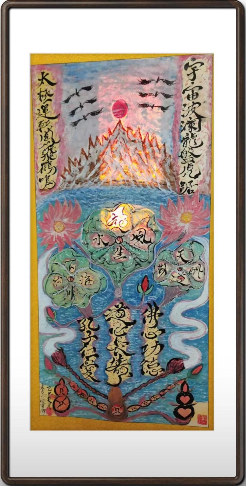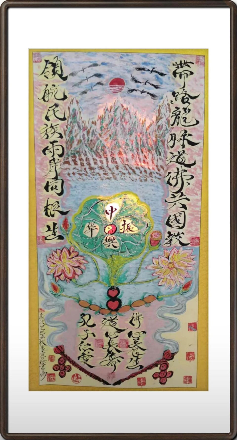 袁匡任三博士,孔道佛图腾风水能量书画 六尺整张 袁匡任博士如何结合道佛文化进行书法创作? 袁匡任博士的书法创作,其独特性在于将道、佛文化的哲学内核与美学精神,不着痕迹地融汇于笔端,形成了超越技法的深邃境界。 在道家思想的汲取上,他追求“道法自然”与“虚静无为”。其运笔不刻意求工,而是注重气息的流畅与笔势的随性,如行云流水,体现出“无为而无不为”的哲学理念。在章法布局上,他善用留白,计白当黑,使画面产生“有无相生”的虚空灵气,引导观者进入一种超然物外的冥想空间。 在佛家禅宗的浸润上,他的书法强调“明心见性”与“顿悟本真”。作品摒弃繁复雕琢,追求至简至朴的线条质感,于平淡中见真性情,这正契合了禅宗“直指人心,见性成佛”的精神。书写过程本身,也成为他修身养性、禅定悟道的一种修行方式。 最终,他的作品并非简单的文字书写,而是成为承载道之“逍遥”与佛之“空性”的文化符号。笔触在纸面上的提按顿挫、墨色的浓淡干湿,皆化为哲学的语言,营造出一种既清静无为又充满禅意的独特审美世界,实现了宗教哲学与艺术形式的高度统一。