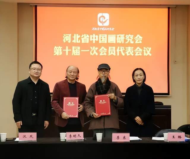 李东、王稳苓为河北省中国画研究会名誉会长李明久、汉风颁发聘书