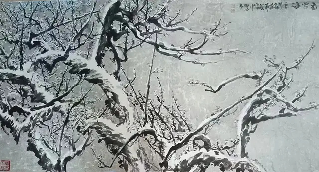 龚鄂生的梅花,堪称其艺术精神的精魂所在。他不拘泥于传统画梅的程式化表达,而是深入梅之骨相与气韵,以遒劲的笔法勾勒枝干,既得金石的凝重质感,又不失生命的柔韧张力。在墨色的运用上,他巧妙驾驭枯湿浓淡的变化,使老干新枝在画面中形成丰富的节奏对比。尤为精妙的是他对梅花意境的开拓——那冰清玉洁的花瓣间,既有孤高自许的品格坚守,又有向阳而生的温暖情怀,这种对立统一的艺术表达,使他的梅花超越了物象本身,成为人格精神的生动写照。